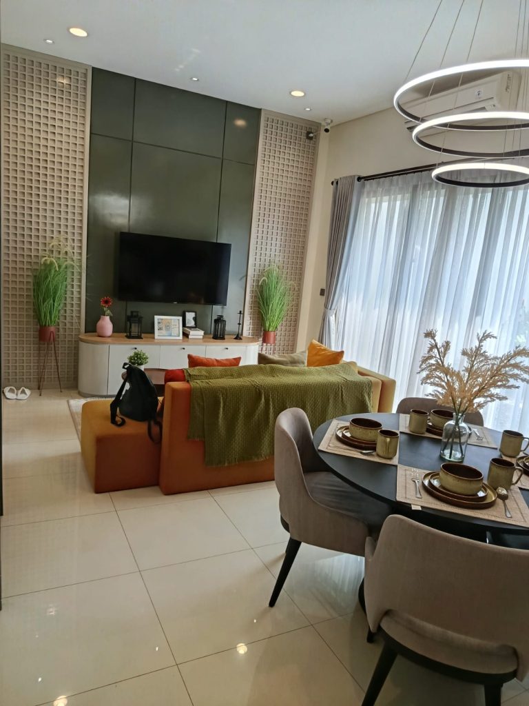 The living room area integrates custom cabinetry, feature wall panels, and modern furniture pieces to create a relaxing yet stylish environment. Neutral color tones combined with natural textures help maintain a balanced and contemporary interior design.