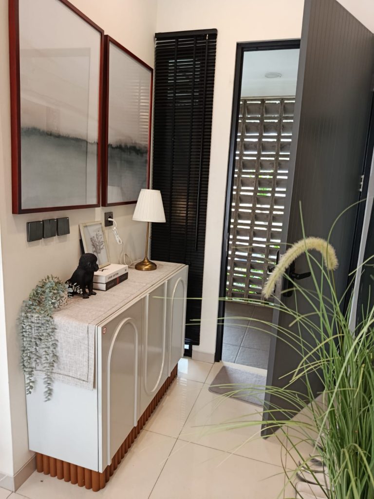 At the entrance area, we installed a custom-built console cabinet combined with decorative wall panels. The furniture design features a minimalist structure with clean lines, creating a welcoming and stylish entryway.