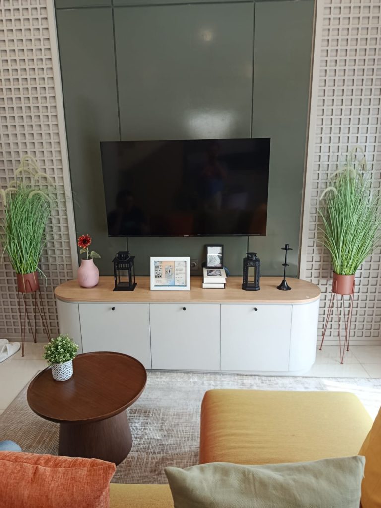 The living room features elegant woodworking details in a custom TV cabinet and wall paneling that combine durability, storage efficiency, and modern aesthetics.