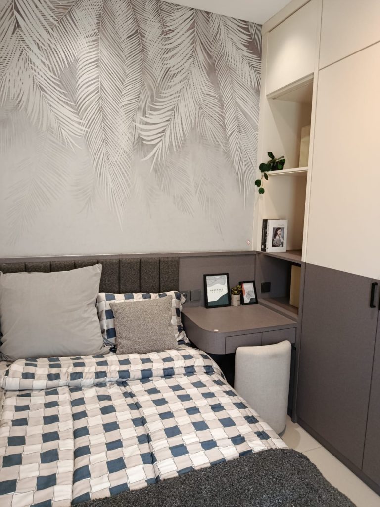 This bedroom demonstrates how thoughtful furniture design can transform limited space into a highly functional living area. The custom-built desk, shelving, and wardrobe system are seamlessly integrated to provide maximum utility without overcrowding the room.